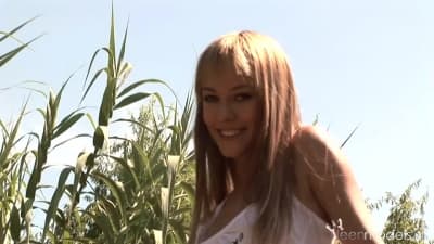 Esta rubia preciosa está deseando sentir en su cuerpo mucha excitación sexual y como está sola, decide tocarse las tetas y el coño al aire libre