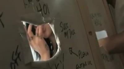 Esta preciosa zorra se sienta en el inodoro para masturbarse, hasta que descubre dos orificios en la pared de donde sale un enorme pene que ella mamará con gusto.