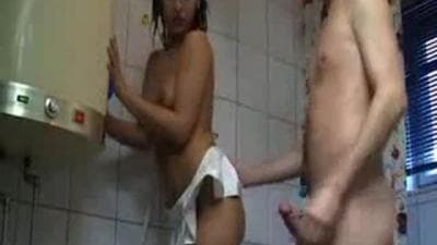 Esta jovencita morena se bañaba tranquilamente hasta que entró su novio desnudo para darle su polla a mamar y así dejarla muy excitada de rodillas.