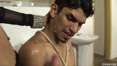 Esta puta transexual se cita con su macho en un baño público, en el que pretende cogérselo completamente pero manteniéndolo sometido a sus órdenes