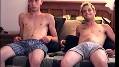 Estos dos jóvenes heterosexuales disfrutan de una película porno mientras un amigo homosexual les hace una paja realmente sabrosa.