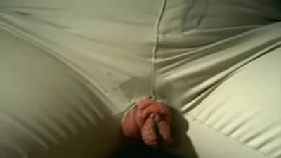 Esta chica no necesita quitarse la ropa para masturbarse. No se quita el pantalón ya que tiene un agujero entre las piernas para masturbar su vagina.