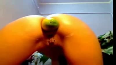Aquí tenemos a una preciosa mujer que se mete varios objetos por el culo en frente de la webcam. Desde un dildo hasta una botella que le entra bien!