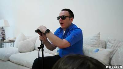 Esta hermosa morena hermosa engañará a su esposo que parece ciego, y lo hace chupando una buena polla en la sala de la casa y la cocina.