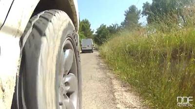 Las enormes tetas desnudas de la chica rebotan con el coche en marcha