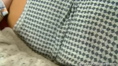 Al encontrar a su cliente dormido en el sofá, esta sirvienta no puede resistirse a ver su polla. Pronto se la mete en el coño y luego en su culo virgen