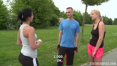 Una pareja se encuentra ejercitandose al aire libre cuando se encuentran con una linda chica que los persuade para tener sexo con ella en la yerba